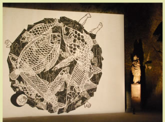 その伝統を継承し、ヴランケン・ポメリー社はカーヴで定期的にアート作品の展示を行っています。6月末まで開催されているのは、EC加盟27カ国の54人のアーティストの作品を紹介する「現代ヨーロッパのアート」展です。各国のアート雑誌と提携し、まさにその国の“今”を表現する作家ばかりを一堂に集めた、興味深い展覧会となっています。またカーヴ内に展示するため、その場で創作されたものもあり、ここでしか見られない作品もいくつかあります。政治や歴史、社会的背景を投影したメッセージ性の強い作品も多く、同時代を生きる多くの人々に鑑賞してもらいたいと願わずにはいられない展覧会です。
