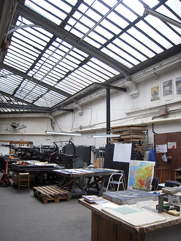 年代、工房は地図の出版を専門に行う会社、ミシャール(Michard)の所有となり、さらに1976年にはパリで有名な老舗の版画工房へと引き継がれます。それがマティス(Henri Matisse/1869-1954)、ピカソ(Pablo Picasso/1881-1973)、ミロ(Joan Miró/1893-1983)、シャガール(Marc Chagall/1887-1985)、ジャコメッティ(Alberto Giacometti/1901-1966)など、20世紀を代表する巨匠たちがリトグラフの制作を行ったことで知られるムルロー工房(Imprimerie Mourlot)でした。現在の工房イデムは、この近代美術史上にも名を刻むムルローの光輝ある版画工房をそのまま継承した貴重な場所。ひとたび足を踏み入れれば、工房の歩んだ歴史を肌で感じることができます。