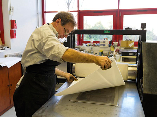 版の空白部分のインクもきれいにふき取り、モスリン布で版画のタイトルにインクをのせたら、いよいよ作品の印刷に入ります。印刷に使用する紙は水に浸して湿らせたベラム紙(*1)。水分によって紙の繊維がしなやかになり、インクの吸い取りがよくなります。余分な水分をふき取った後、プレス機にセットした版に印刷紙を重ね合わせます。