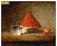 籠にピラミッド状に盛られた木いちご、水の入ったコップ、2本のカーネーション、さくらんぼがふたつと桃がひとつ。わたしたちにとって、なんら珍しくもない簡素なモティーフが褐色の背景に描かれています。しかしカーネーションの白と木いちごの赤の対比、グラスと水の透明感、つややかなさくらんぼの質感など、視線を動かす度に、はっとさせられる不思議な魅力に満ちています。フランスの哲学者で作家、そしてシャルダンの崇拝者であったディドロ(Denis Diderot/1713-1784)は、シャルダン作品の素晴らしさを「この魔術についてはまったく分からない」と称しました。そんな“魔術”を実感できる作品です。