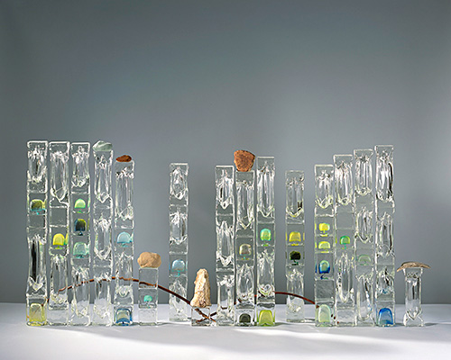イザベル・モノー(Isabelle Monod/1945-)は、ガラス工芸家の夫と南仏で制作するジュネーヴ生まれのアーティストです。小さなキューブを集めて、中に小さなオブジェを入れ、風が通る軽やかで繊細なインスタレーションを作りました。